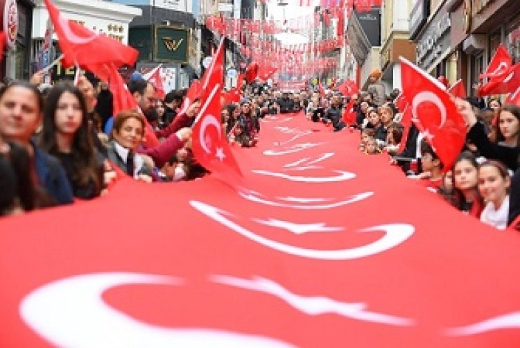Belediye bandosu eşliğindeki bu anlamlı yürüyüşe katılım sağlayan coşkulu kalabalık ellerindeki bayraklarla bayram ruhunu yansıttı. Çocuklar ise renkli kıyafetleri ve yüzlerindeki gülümsemelerle yürüyüşe renk kattı.