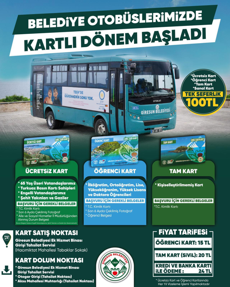 Giresun Belediyesi şehir içi otobüslerde 15 Mayıs 2026’dan itibaren kartlı sistemi başlatıyor. Nakit ödeme kalkacak, üç kart türü (ücretsiz, öğrenci, tam) kullanılacak. Kart başvuruları ve dolum noktaları belirlendi. 65 yaş, engelliler ücretsiz seyahat edecek.