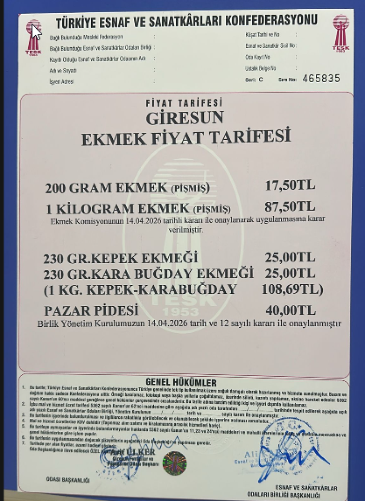 Giresun'da ekmek fiyatları arttı. 200 gr ekmek 17,50 TL, 1 kg ekmek 87,50 TL oldu. Kepek/karabuğday 230 gr 25,00 TL, 1 kg 108,69 TL. Pazar pidesi 40,00 TL. Karar 14.04.2026'da alındı.