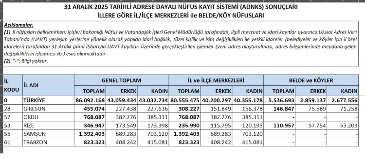 TÜİK’in 2025 yılı Adrese Dayalı Nüfus Kayıt Sistemi sonuçlarına göre Türkiye nüfusu 86 milyon 92 bin 168 kişiye yükseldi. Nüfus artış hızı binde 5 olurken, yaşlanma eğilimi ve kentleşme artışı dikkat çekti.