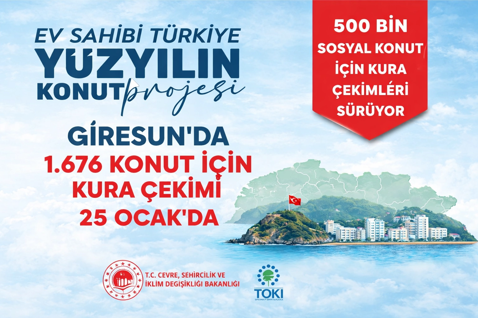 25 Ocak Pazar günü de Giresun’da 1.676 konut için kura çekimi yapılacak.19-25 Ocak haftasında toplam 45 bin 909 sosyal konutun daha hak sahipleri belirlenecek. Böylece 25 Ocak’ta kurası tamamlanan il sayısı 32’ye, hak sahipleri belirlenen konut sayısı ise 121 bin 265’e yükselecek.