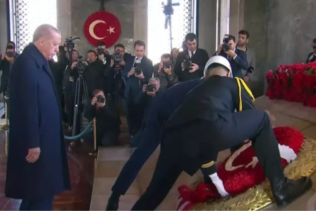 Cumhurbaşkanı Erdoğan, kırmızı beyaz karanfillerle hazırlanan ay yıldız motifli çelengi Atatürk'ün mozolesine takdim etti.