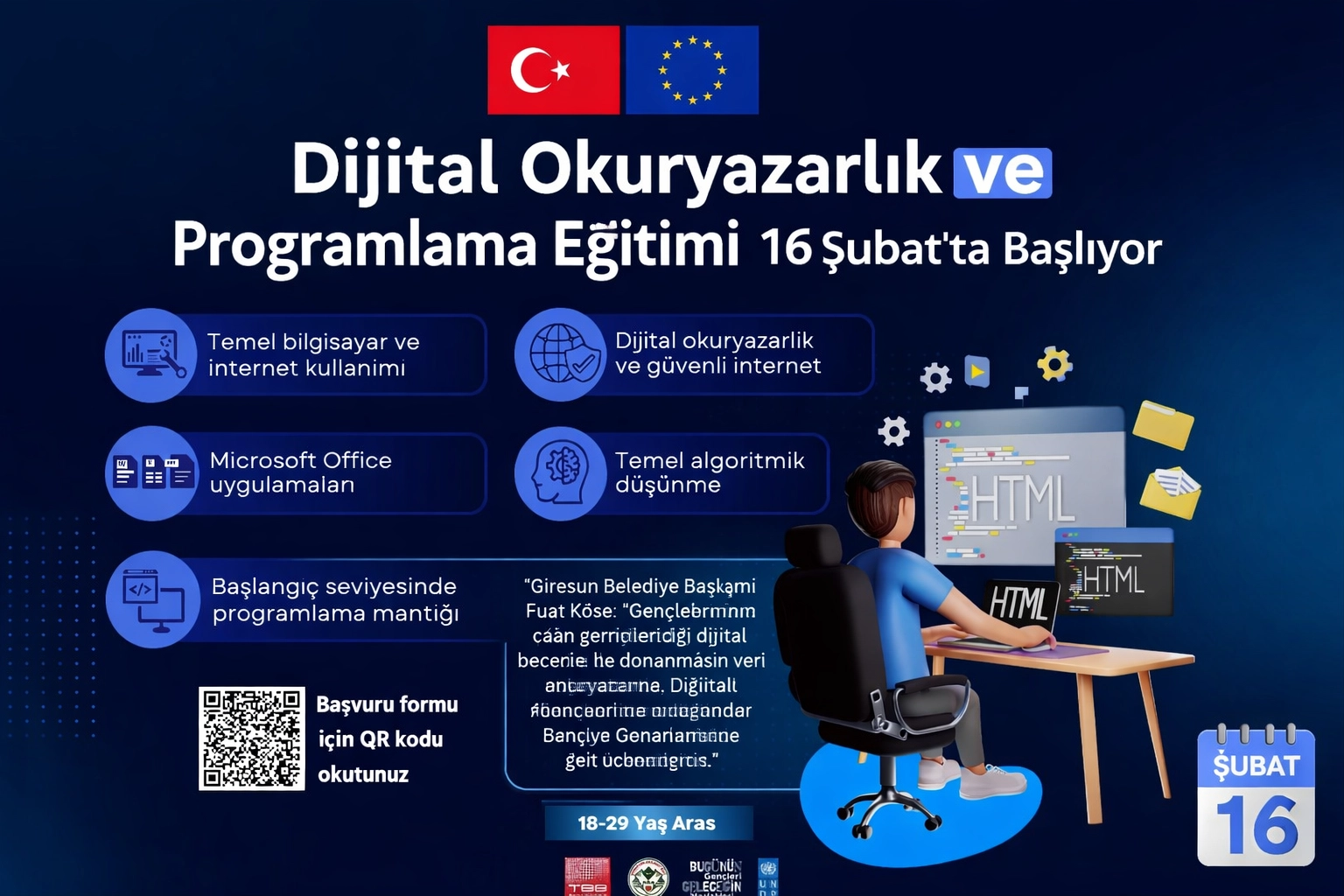 Giresun Belediyesi, gençlerin dijital dünyada daha donanımlı bireyler olarak yer almasını sağlamak amacıyla önemli bir eğitim programını hayata geçiriyor. “Dijital Okuryazarlık ve Programlama Temelleri” başlığıyla düzenlenen eğitim, 16 Şubat tarihinde çevrimiçi olarak başlayacak.