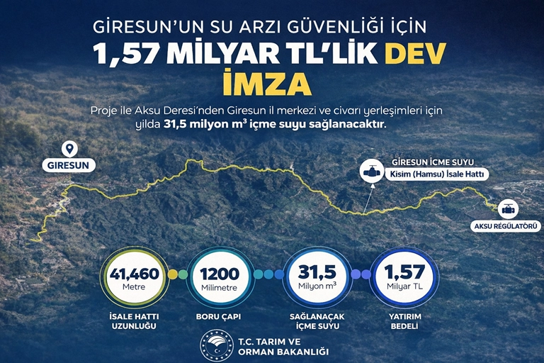 Tarım ve Orman Bakanı İbrahim Yumaklı, Giresun’un içme suyu ihtiyacını karşılayacak stratejik projenin ilk etap inşaat sözleşmesinin imzalandığını duyurdu. Bakanlık açıklamasında, Aksu Deresi kaynaklı suyun il merkezi ve çevre yerleşimlere ulaştırılacağı, ilk etapta 41 bin 460 metre uzunluğunda ve 1200 milimetre çapında ham su isale hattı inşa edileceği bildirildi. Yatırım bedeli 1,57 milyar lira olarak açıklandı.