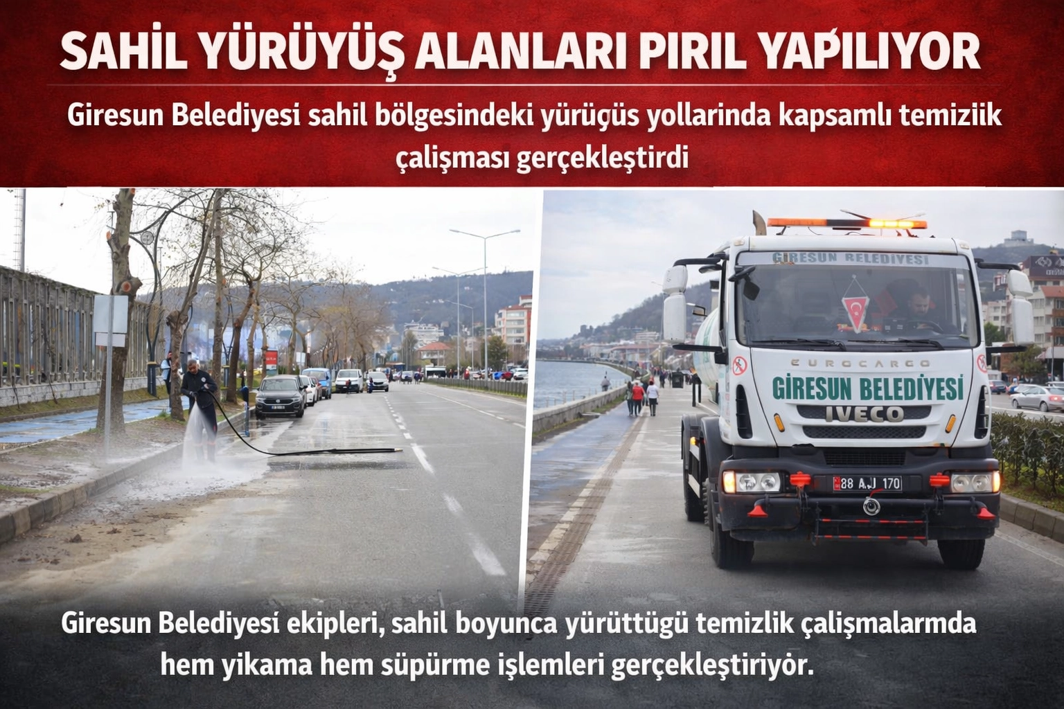 Giresun Belediyesi, sahil bandında yürüttüğü temizlik çalışmalarıyla kentin en yoğun kullanılan sosyal alanlarını daha sağlıklı ve düzenli hale getiriyor. Giresun Belediyesi Temizlik İşleri Müdürlüğü ekipleri tarafından yürütülen kapsamlı çalışma kapsamında yürüyüş yolları baştan sona temizlendi.