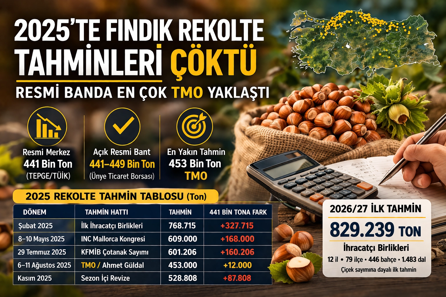 Mallorca’daki INC kongresi için yayımlanan açık haber metinlerinde mayıs tahmini 609 bin ton olarak yer aldı. Karadeniz Fındık ve Mamulleri İhracatçıları Birliği temmuz sonunda 601 bin 206 tonluk tahmin açıkladı. TMO Genel Müdürü Ahmet Güldal’ın açıklamasında ise 2025 rekoltesi 453 bin ton olarak verildi. Kasım revizesi de açık erişimdeki geriye dönük sektör kayıtlarında 528 bin 808 ton olarak yer aldı.Aşağıdaki tablo 441 bin tonluk TEPGE/TÜİK merkez verisi esas alınarak hazırlandı.
