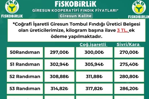 Fındık Trim Satış Kooperatifleri Birliği (FİSKOBİRLİK), serbest piyasadaki dalgalanmaların etkisiyle alım fiyatlarında yeniden değişikliğe gitti. 19 Kasım 2025 tarihinde Giresun kalite 50 randıman fındık için 290 TL/kg olarak açıkladığı fiyatı, piyasa hareketliliği ve döviz etkisi nedeniyle 25 Kasım 2025 itibarıyla 297 TL/kg seviyesine yükseltti. Ancak fiyat artışı üreticinin beklentisini karşılamaya yetmedi.