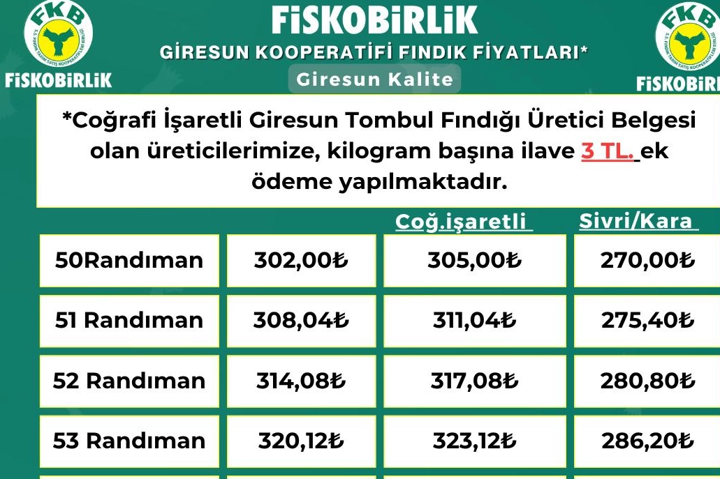 FİSKOBİRLİK 04.11.2025 tarihi itibariyle 50 randuman tombul fındık alım fiyatı 305.-TL olarak açıkladı.
