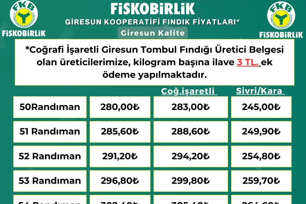 FİSKOBİRLİK’in bugün (05.12.2025) Giresun kalite tombul fındıkta alım fiyatını 280 TL/kg olarak açıkladı. Fiskobirlik ekonomik durumu nedeniyle büyük alıcı olmamasına rağmen üretici adına direnmeye çalışması sonuçsuz kalıyor.