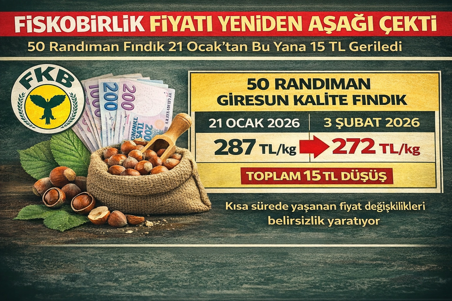 Fındık Tarım Satış Kooperatifleri Birliği (FİSKOBİRLİK), 3 Şubat 2026 tarihi itibarıyla yayımladığı yeni fiyat listesiyle, Giresun kalite kabuklu fındık alım fiyatlarını bir kez daha aşağı yönlü güncelledi. Açıklamaya göre 50 randıman Giresun kalite fındık 272 TL/kg seviyesinden alıma devam edilecek.