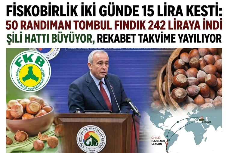 FİSKOBİRLİK, 25 Mart 2026 tarihli yeni listede 50 randıman Giresun kalite tombul fındık alım fiyatını 242 TL/kg’a çekti. Aynı ürün 23 Mart’ta 257 TL/kg idi. İki günde 15 liralık düşüş yaşandı. Kayıp, 8 Ocak’taki 307 liraya göre 65 liraya, Eylül 2025’te görülen 347 liralık zirveye göre 105 liraya çıktı. Piyasada artık yalnız fiyat değil, fiyatı aşağı iten düzen tartışılıyor.