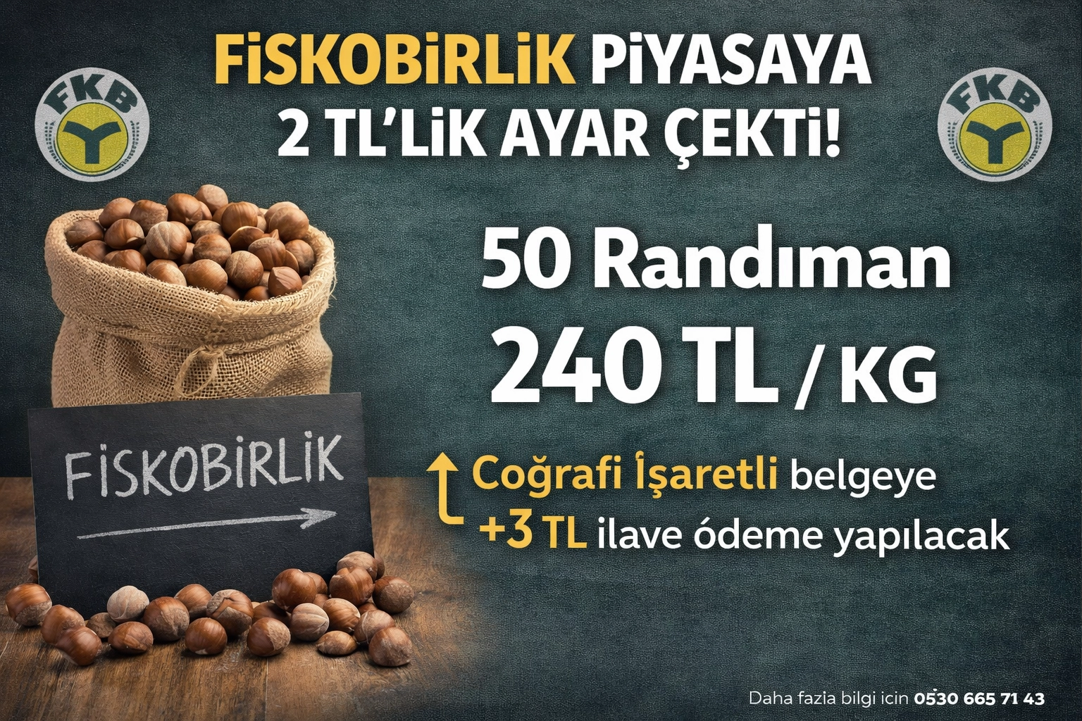 FİSKOBİRLİK’in yeni listesinde Giresun kalite 50 randıman fındık 240 liraya indi.