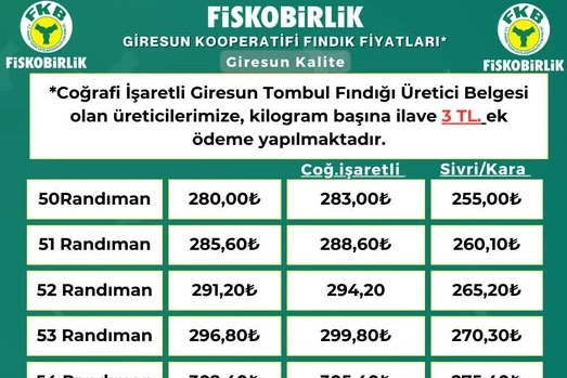 FİSKOBİRLİK’in (24.12.2025) Giresun kalite tombul fındıkta alım fiyatını 280 TL/kg olarak açıkladı.