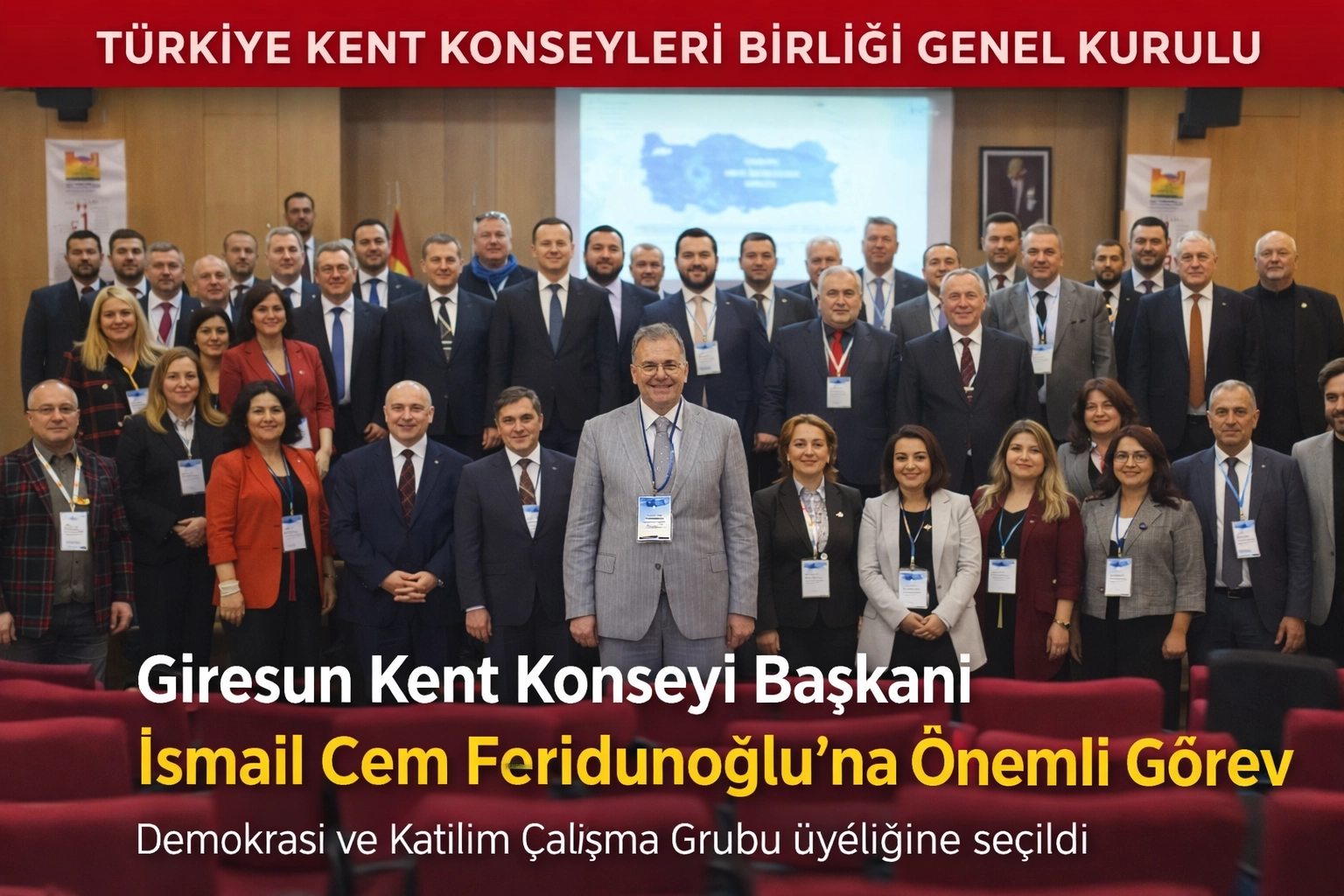 Türkiye Kent Konseyleri Birliği’nin 16. Genel Kurulu, İstanbul’da geniş katılımla gerçekleştirildi. Genel kurulda yapılan seçimler sonucunda, Giresun Kent Konseyi Başkanı İsmail Cem Feridunoğlu, Birliğin en önemli tematik organlarından biri olan “Demokrasi ve Katılım Çalışma Grubu” üyeliğine seçildi.