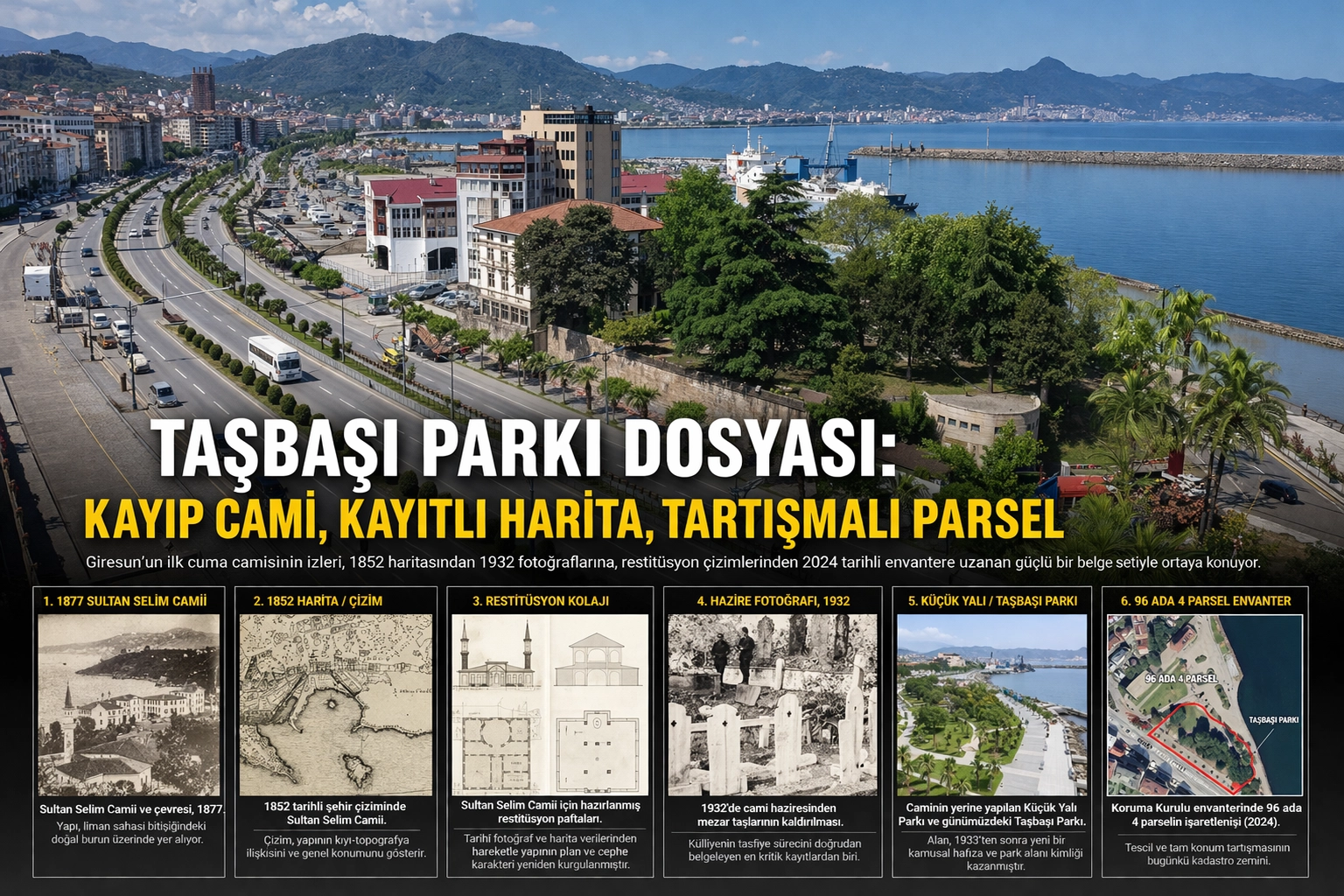 Giresun’un bilinen ilk cuma camisi sayılan Sultan Selim Camii ya da Hüdâvendigâr Camii’nin bugünkü Taşbaşı Parkı alanında bulunduğu tarihî kayıt, fotoğraf, harita, uzman raporu ve tescil dosyasıyla doğrulanıyor. Bugünkü çekişme, caminin varlığında değil; tam konumunun 96 ada 4 parsel içinde mi, yoksa liman dolgu sahasıyla birlikte daha geniş bir alanda mı kaldığı, bu belirsizliğin rekonstrüksiyon ve tapu iptal ve tescil davası üzerinde nasıl sonuç doğuracağı noktasında büyüyor.