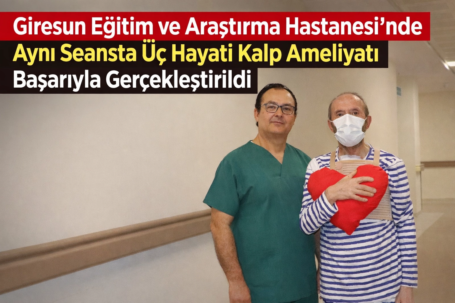 Giresun İl Sağlık Müdürlüğü’ne bağlı Giresun Eğitim ve Araştırma Hastanesi Kalp Damar Cerrahisi Kliniği’nde, üç ciddi kalp ve damar hastalığı bulunan bir hastaya aynı ameliyatta üç büyük cerrahi müdahale başarıyla uygulandı.