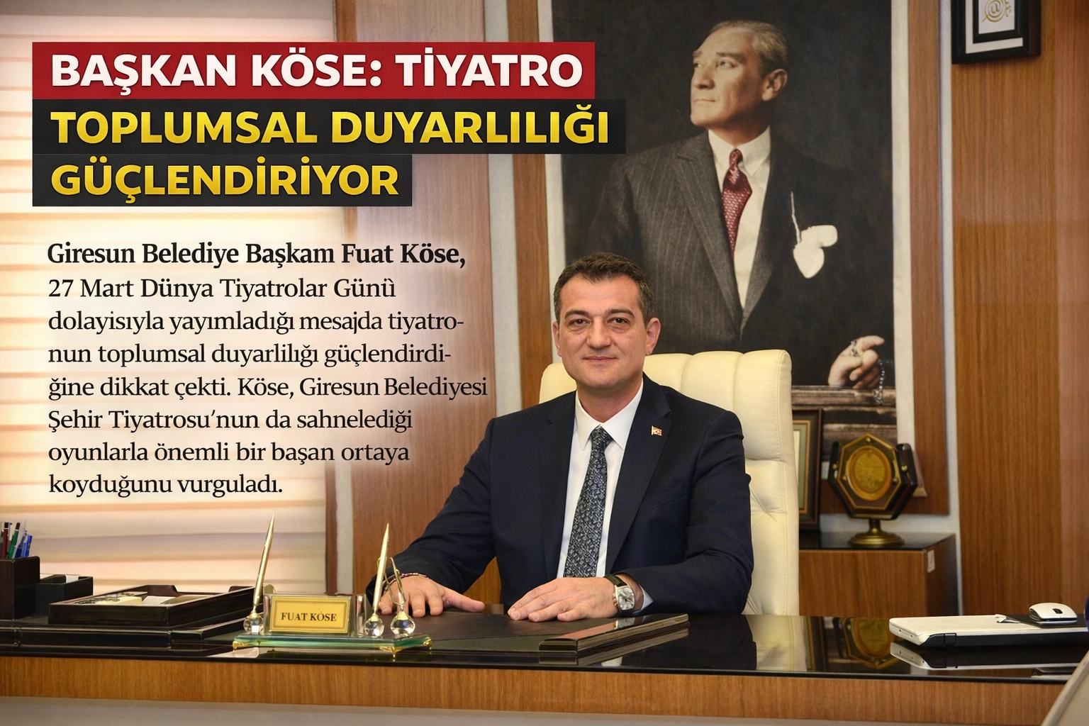 Giresun Belediye Başkanı Fuat Köse, 27 Mart Dünya Tiyatrolar Günü dolayısıyla yayımladığı mesajda tiyatronun toplumsal duyarlılığı artıran ve kültür hayatını taşıyan en güçlü sanat alanlarından biri olduğunu söyledi. Köse, Giresun Belediyesi Şehir Tiyatrosu’nun da sahnelediği oyunlarla önemli bir başarı ortaya koyduğunu vurguladı.