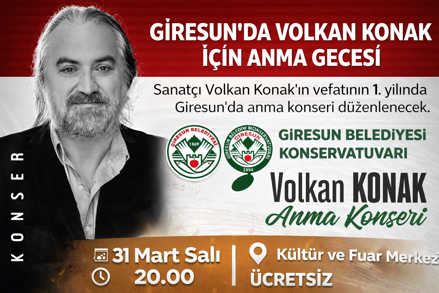 Giresun Belediyesi, Volkan Konak’ın vefatının 1. yılında anma konseri düzenliyor. Giresun Belediye Konservatuvarı’nın sahne alacağı etkinlik 31 Mart Salı günü saat 20.00’de Kültür ve Fuar Merkezi’nde ücretsiz olarak gerçekleştirilecek.