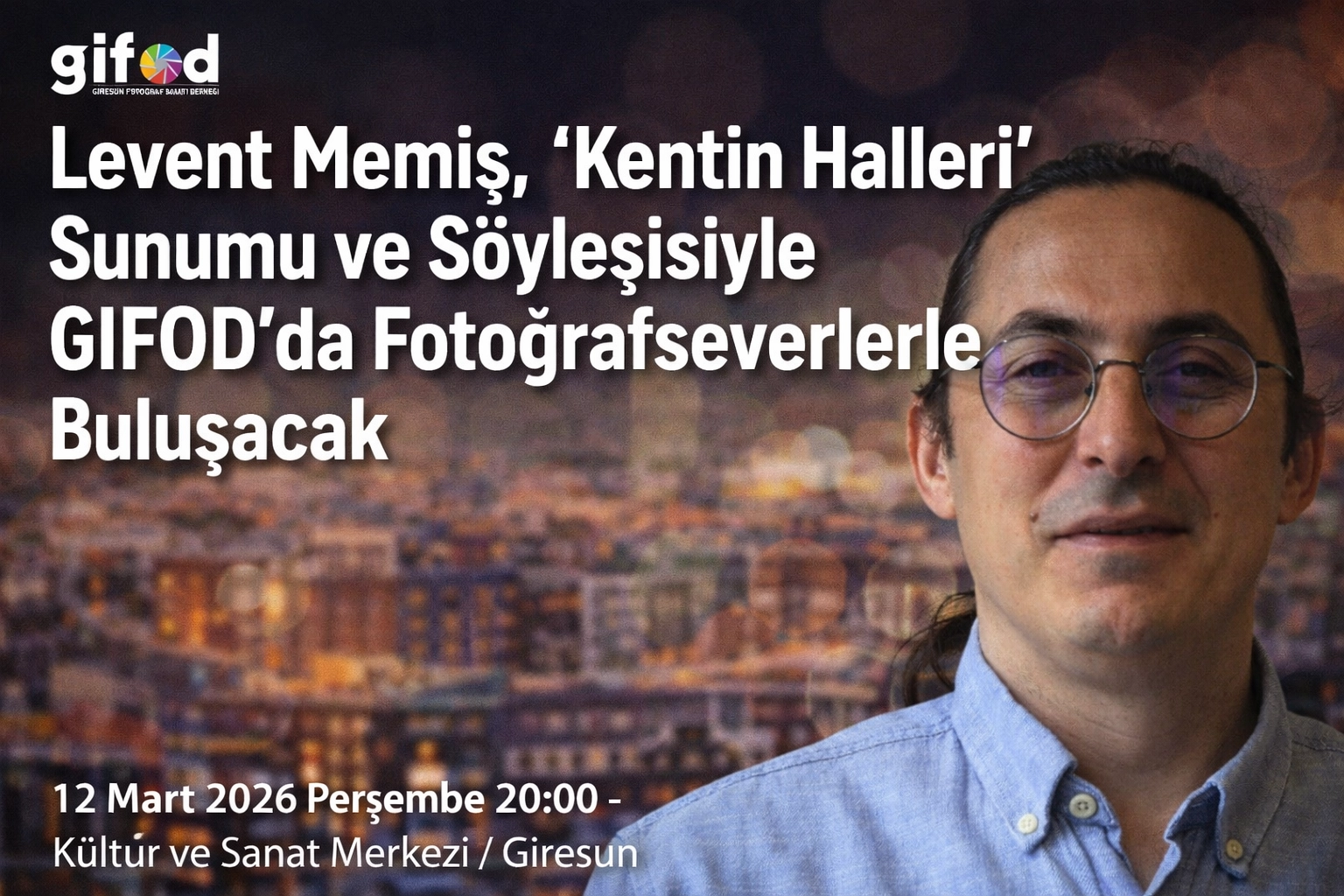 GİFOD üyesi ve fotoğraf sanatçısı Levent Memiş, “Kentin Halleri” başlıklı fotoğraf sunumu ve söyleşisiyle 12 Mart Perşembe akşamı Giresun’da sanatseverlerin karşısına çıkacak. Etkinlikte, Avrupa kentlerinde çektiği fotoğraflardan oluşan seçkiyi paylaşacak olan Memiş, kent yaşamını görsel bir anlatıyla yorumlayacak.