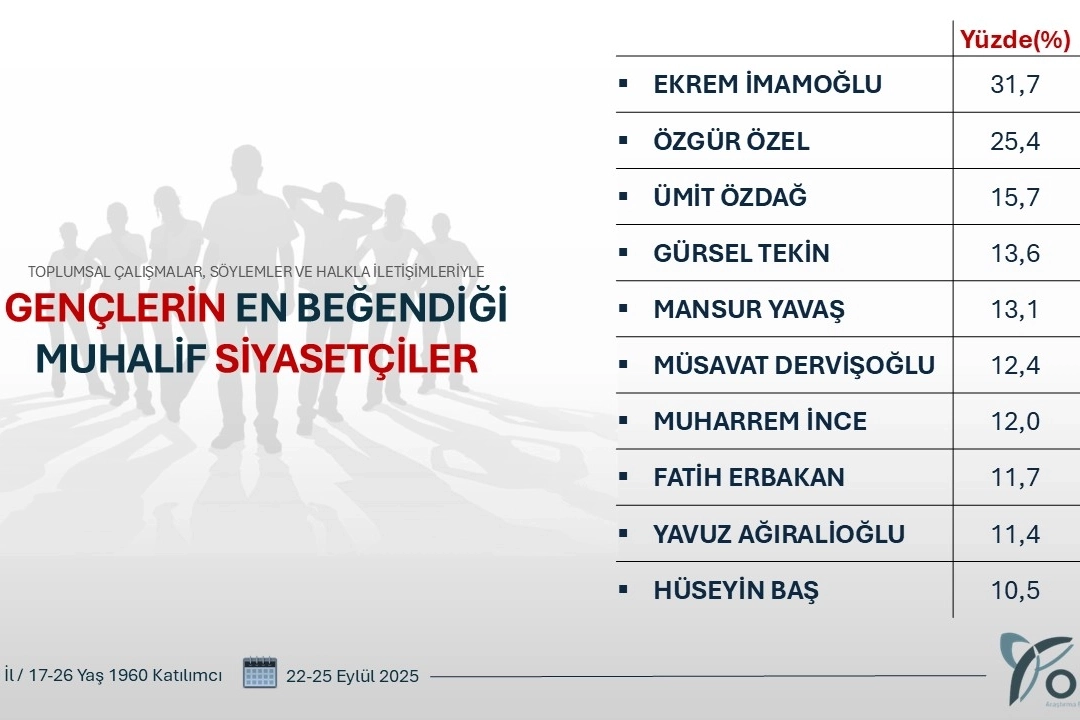 Sıra Siyasetçi Adı Beğeni Oranı (Yüzde) 1. Ekrem İmamoğlu 31,7% 2. Özgür Özel 25,4% 3. Ümit Özdağ 15,7% 4. Gürsel Tekin 13,6% 5. Mansur Yavaş 13,1% 6. Müsavat Dervişoğlu 12,4% 7. Muharrem İnce 12,0% 8. Fatih Erbakan 11,7% 9. Yavuz Ağıralioğlu 11,4% 10. Hüseyin Baş 10,5%Yerel Yöneticiler ve Parti Başkanları Dengesi