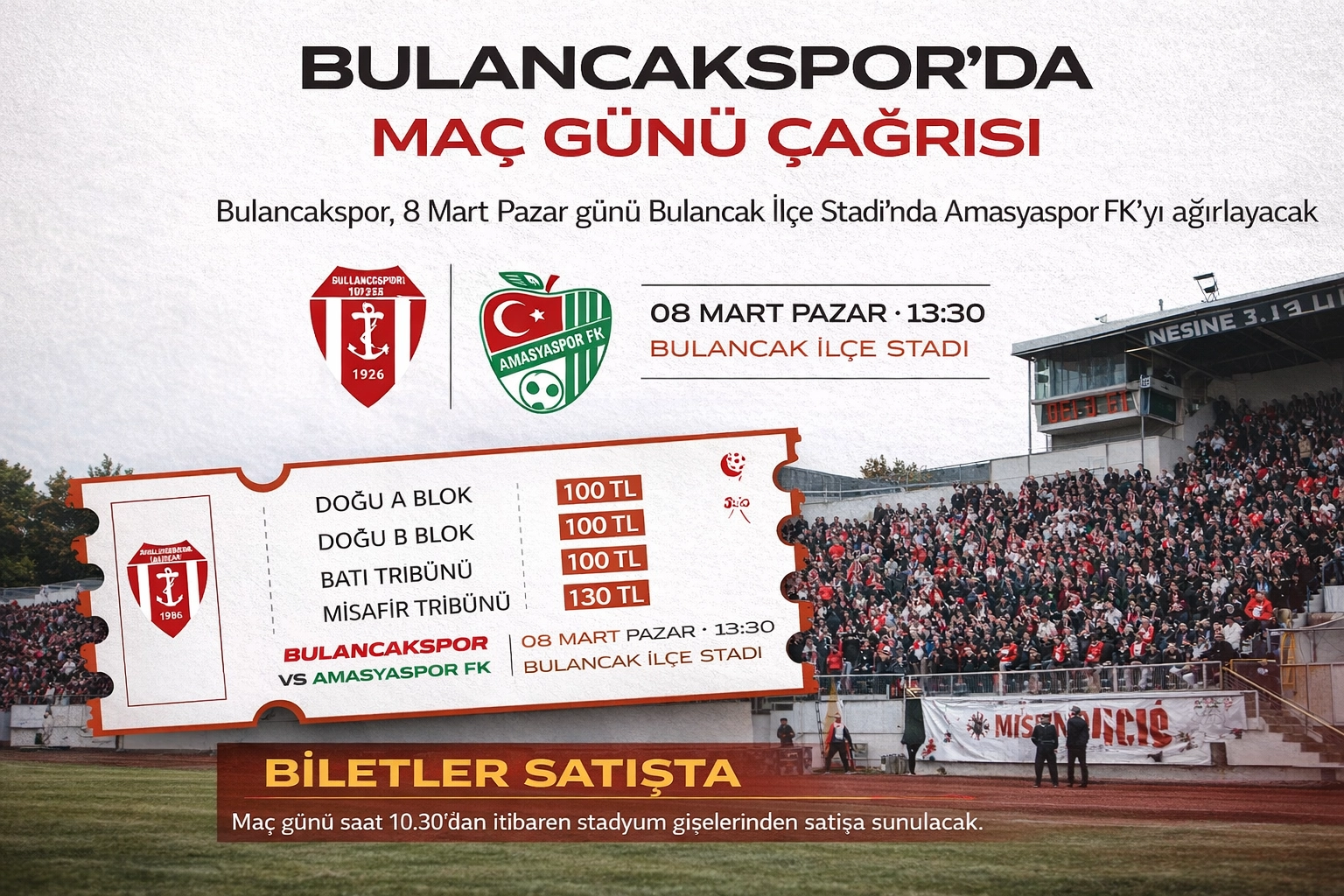 Nesine 3. Lig’de mücadele eden Bulancakspor, ligin kritik haftalarından birinde kendi sahasında Amasyaspor FK ile karşı karşıya gelecek. 8 Mart Pazar günü saat 13.30’da Bulancak İlçe Stadı’nda oynanacak mücadele öncesinde kulüp taraftarlara tribün çağrısında bulundu.