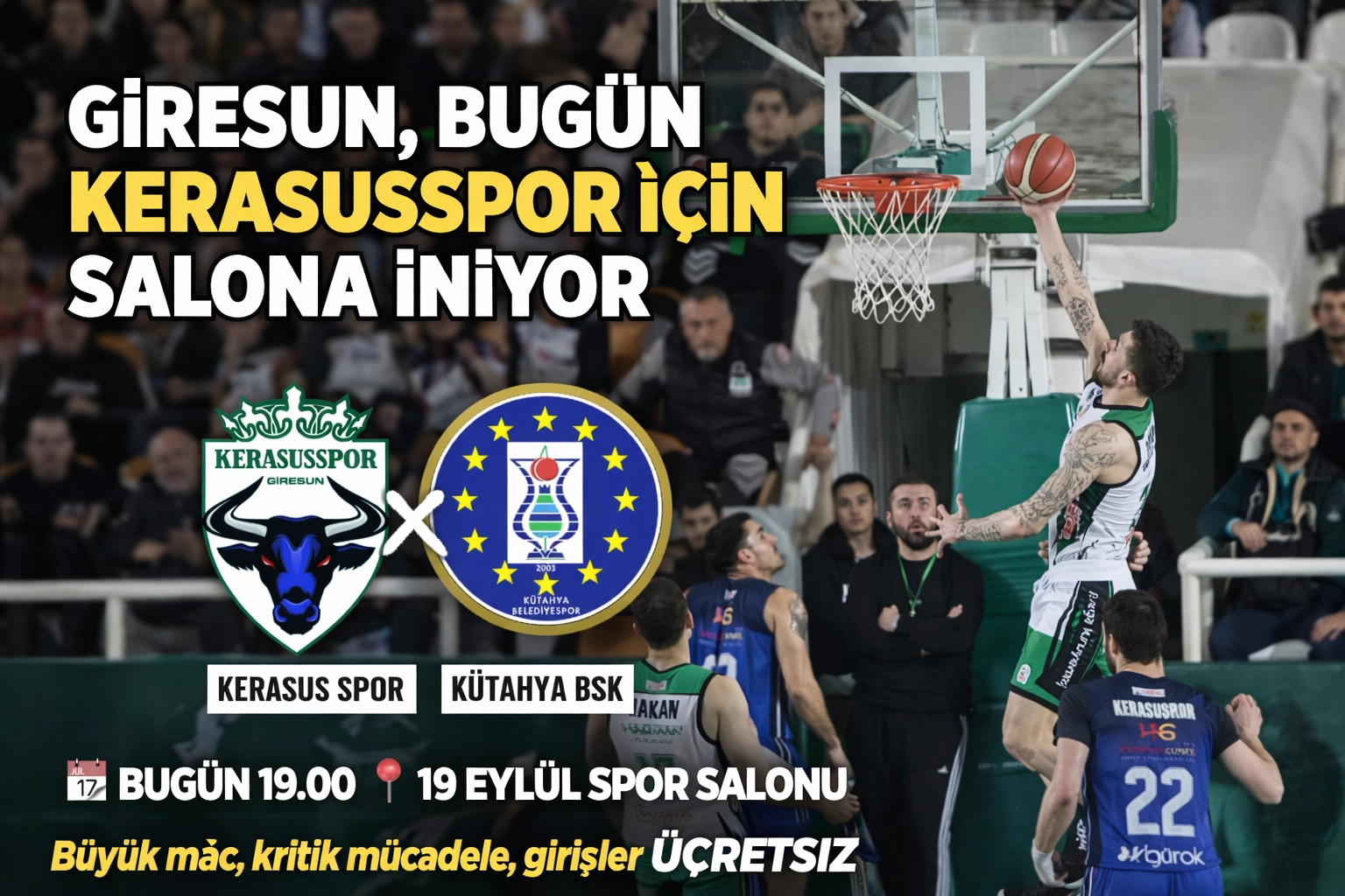 Girişlerin ücretsiz olması da bu akşamı yalnızca basketbolseverler için değil, şehir adına ortak bir destek buluşmasına dönüştürüyor.