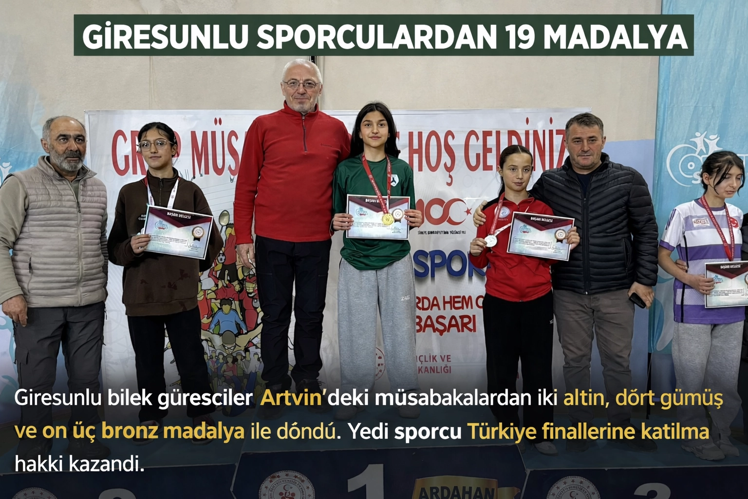 Giresunlu bilek güreşi sporcuları, Artvin’de düzenlenen Okul Sporları Yıldızlar Grup Müsabakalarında 21 sporcu ile katıldıkları organizasyondan 19 madalya ile döndü. 7 sporcu Türkiye finallerine katılma hakkı kazandı.
