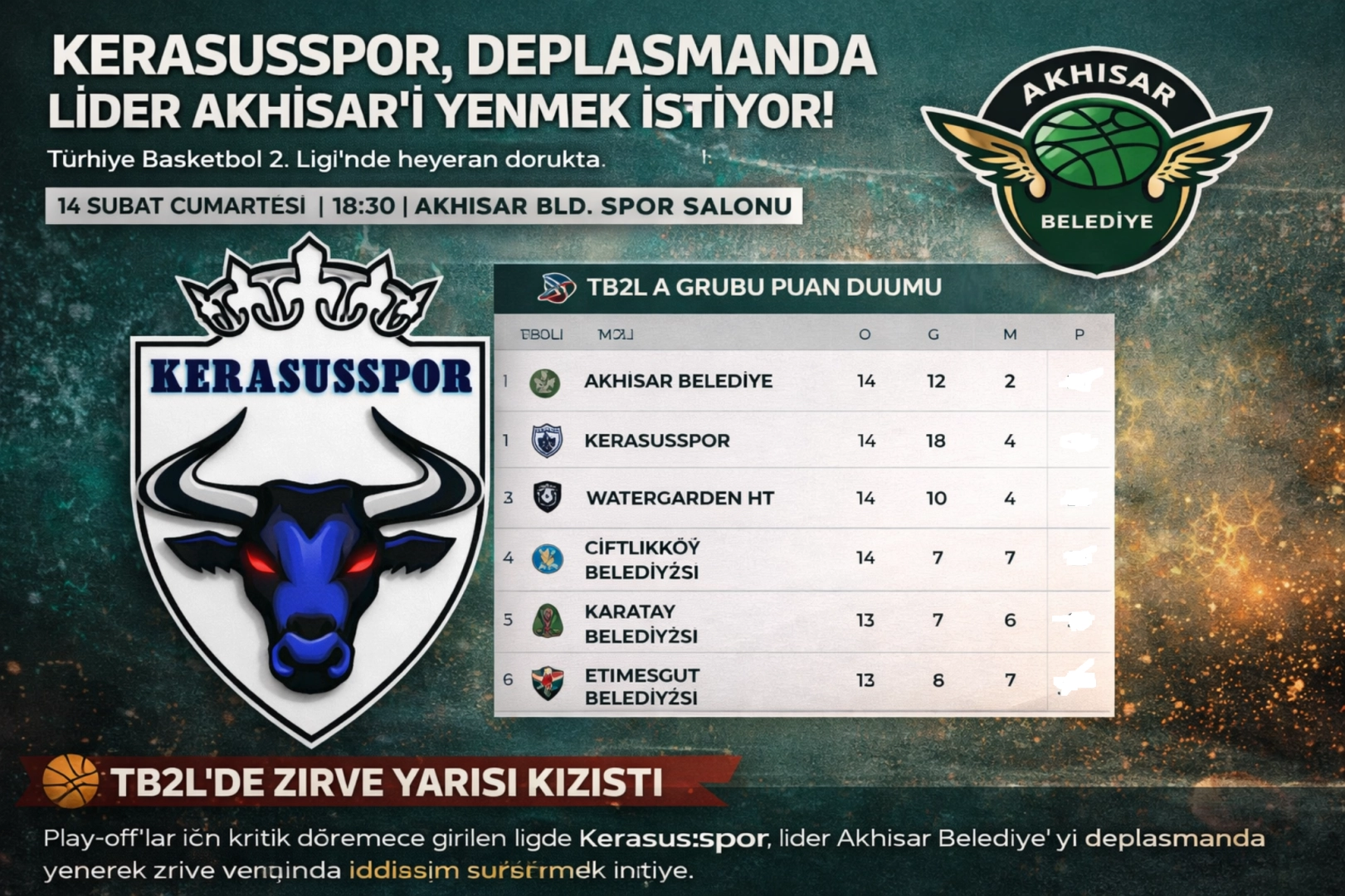 TB2L A Grubu puan tablosuna bakıldığında Akhisar Belediye 12 galibiyetle liderlik koltuğunda bulunurken, Kerasus Spor ise 10 galibiyetle ikinci sırada yer alıyor. Aradaki puan farkının kapanması adına bu mücadele, sezonun en kritik karşılaşmalarından biri olarak görülüyor.