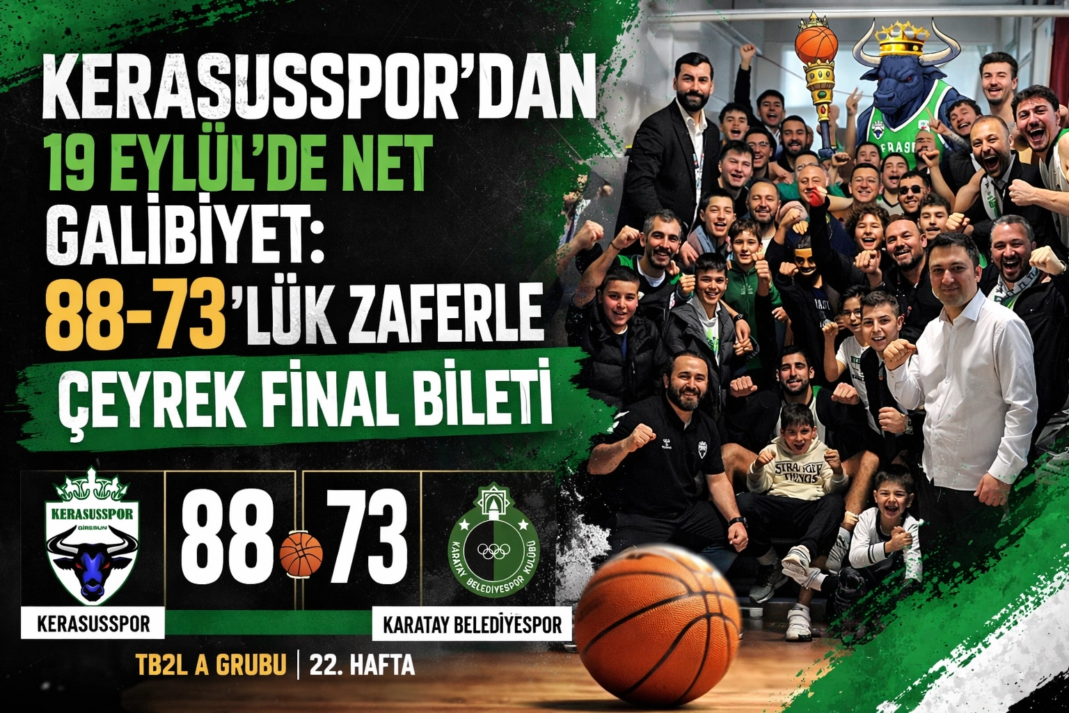 KERASUSSPOR’DAN 19 EYLÜL’DE NET GALİBİYET: 88-73’LÜK ZAFERLE ÇEYREK FİNAL BİLETİ