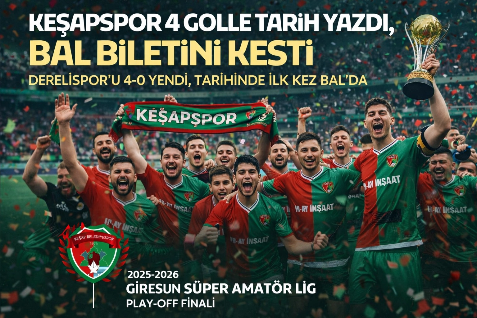 Giresun amatör futbolunda sezonun en ağır hesabı Keşap’ta kapandı. Keşapspor, 25 Mart 2026 Çarşamba günü oynanan play-off şampiyonluk maçında Derelispor’u farklı geçti, yalnız bir maçı değil bir dönüm noktasını kazandı. İlçe stadındaki 4-0’lık sonuç, Keşap ekibini tarihinde ilk kez Bölgesel Amatör Lig’e taşıdı.