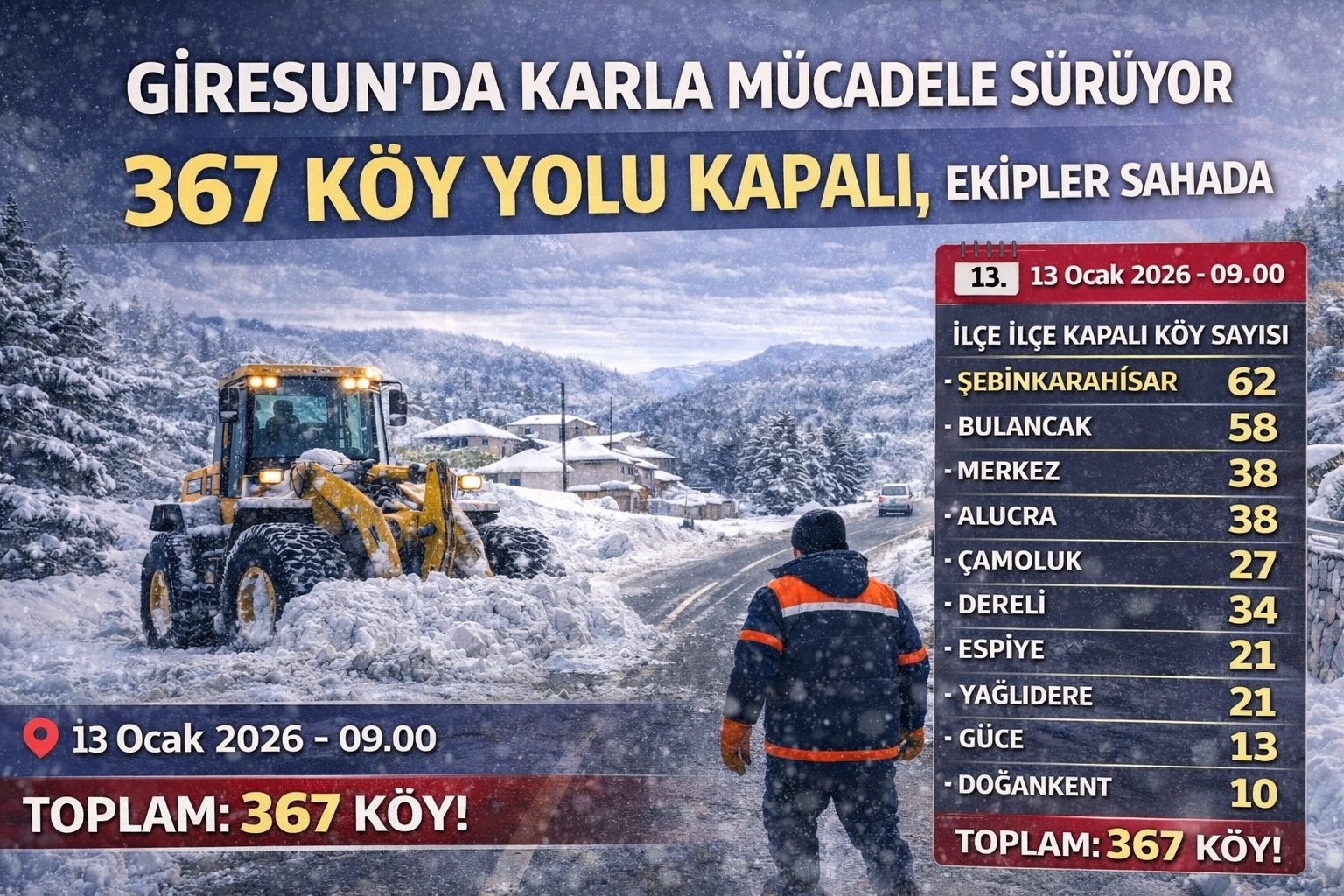 Giresun genelinde etkisini artıran kar yağışı sonrası yürütülen karla mücadele çalışmaları aralıksız devam ediyor. Giresun İl Özel İdaresi Yol ve Ulaşım Hizmetleri Müdürlüğü’nün 13 Ocak 2026 tarihli, saat 09.00 itibarıyla hazırlanan Kar Mücadelesi Takip Formuna göre, il genelinde 367 köy yolu ulaşıma kapalı bulunuyor.