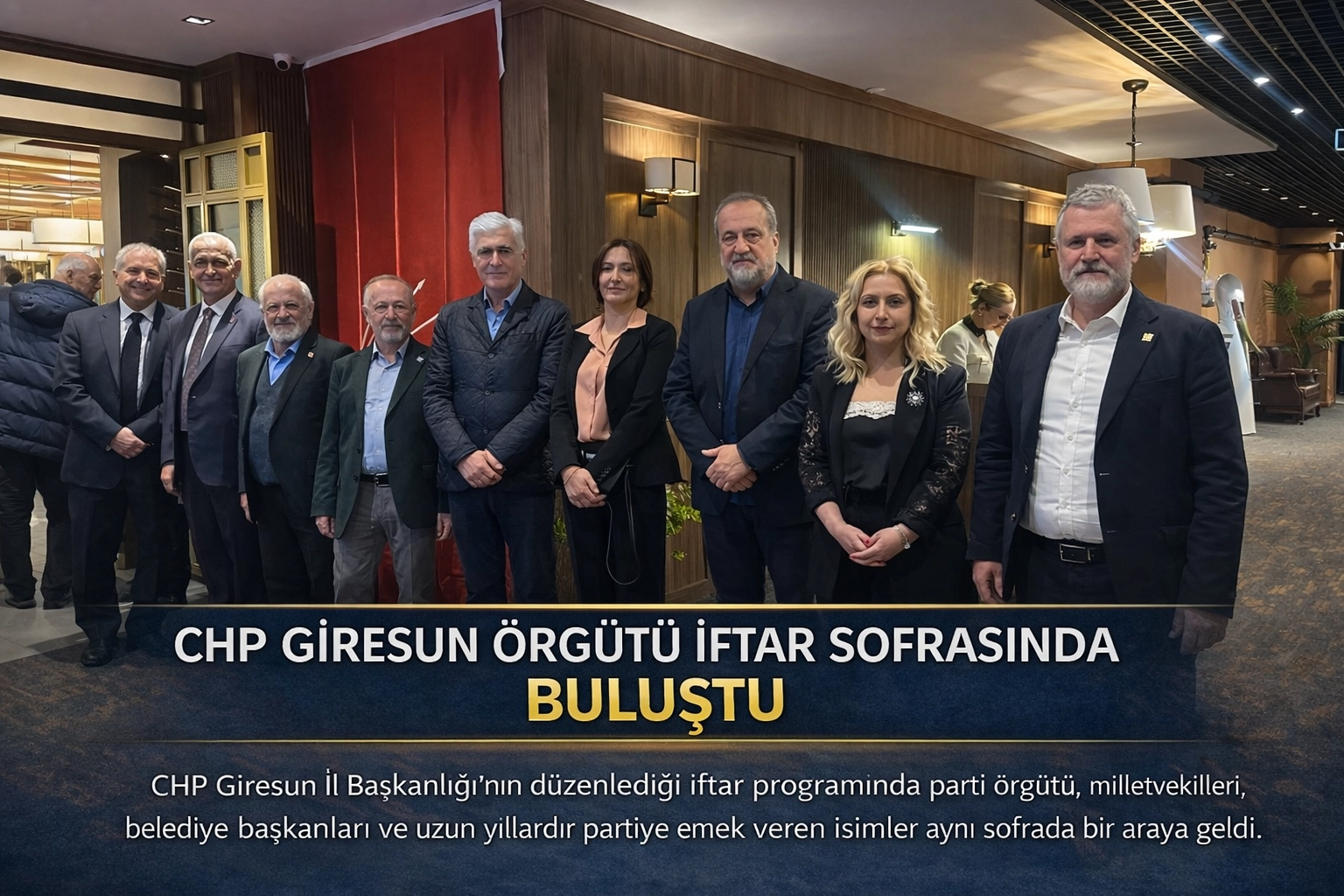 CHP Giresun İl Başkanlığı’nın düzenlediği iftar programında parti örgütü, milletvekilleri, belediye başkanları, ilçe başkanları ve uzun yıllardır partiye emek veren isimler aynı sofrada bir araya geldi. Program, teşkilat içinde birlik ve dayanışma mesajının öne çıktığı buluşmalardan biri oldu.