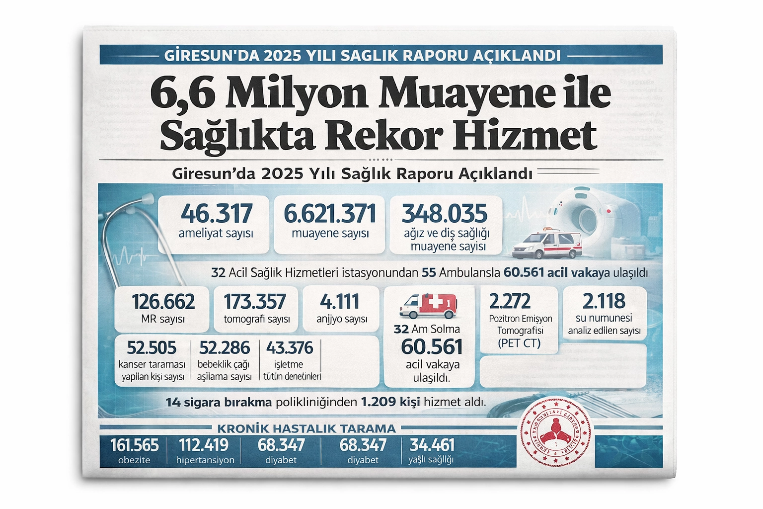 Giresun’un 2025 yılına ait sağlık hizmetleri verileri kamuoyuyla paylaşıldı. Mehmet Fatih Serdengeçti, bir yıl boyunca sunulan sağlık hizmetlerine ilişkin rakamların, kentin güçlü sağlık altyapısını ve fedakâr sağlık çalışanlarının emeğini açıkça ortaya koyduğunu vurguladı.