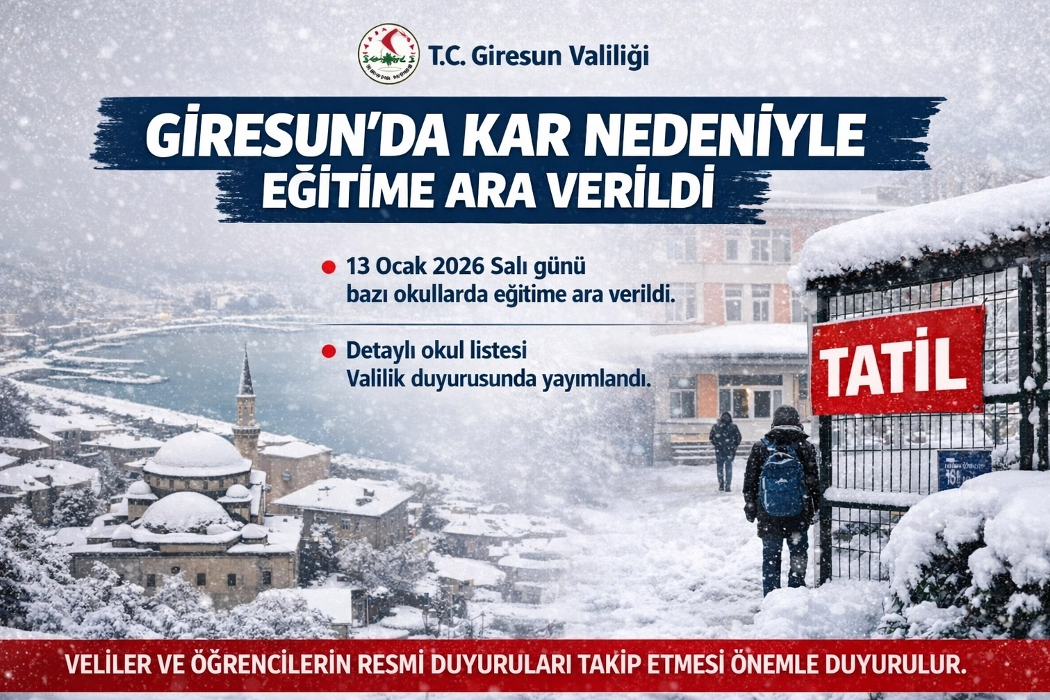 Giresun genelinde etkisini artıran yoğun kar yağışı, eğitim-öğretimde geçici bir duraksamaya yol açtı. T.C. Giresun Valiliği, olumsuz hava koşulları nedeniyle 13 Ocak 2026 Salı günü il merkezi ve ilçelerde bazı okullarda eğitime ara verildiğini duyurdu.