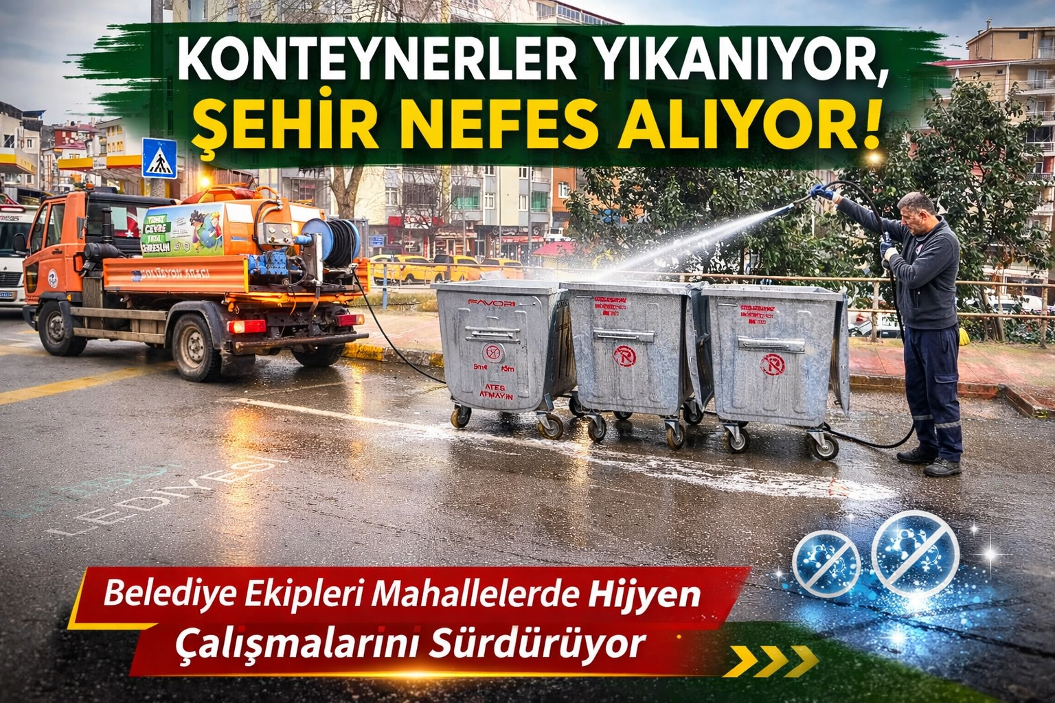 BELEDİYE KONTEYNERLERİ YIKAYARAK HİJYEN ÇALIŞMALARINI SÜRDÜRÜYOR