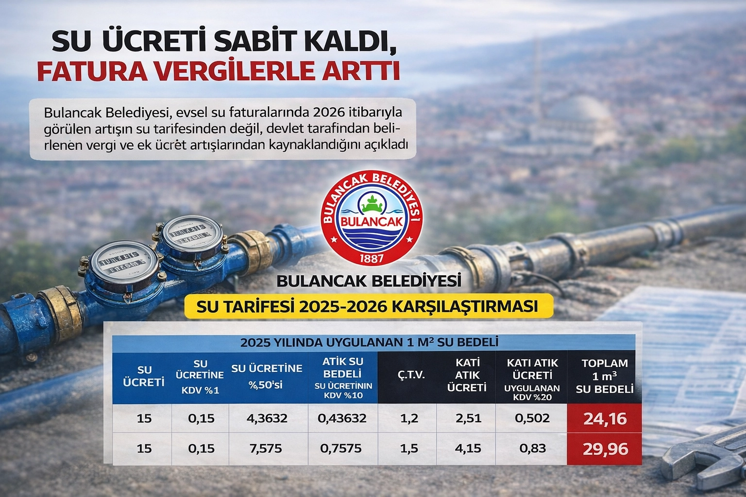 Bulancak Belediyesi, evsel su faturalarında 2026 itibarıyla görülen artışın su tarifesinden değil, devlet tarafından belirlenen vergi ve ek ücret artışlarından kaynaklandığını açıkladı.