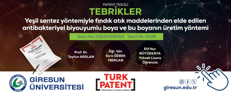 Giresun Üniversitesi’nde fındık atıklarından antibakteriyel biyouyumlu boya üretildi. Prof. Dr. Tayfun Arslan, Öğr. Gör. Esra Özbek Mercan ve Elifnur Büyükkaya’nın çalışması, 1 Nisan'da Türk Patent ve Marka Kurumu tarafından tescillendi.