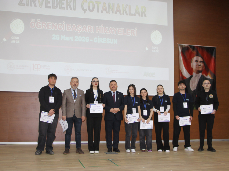 Giresun’da düzenlenen Genç AR-GE Zirvedeki Çotanaklar Programı, sözlü ve poster sunumlarla tamamlandı. Bilimsel projelerden sportif başarılara, sanatsal üretimlerden sosyal girişimlere uzanan öğrenci çalışmaları salonda geniş katılımla sergilendi.