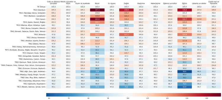 Türk Lirası’nın farklı bölgelerdeki satın alma gücünü ölçmek amacıyla gerçekleştirilen çalışmada, ayrıntılı olarak tanımlanmış ortak bir mal ve hizmet sepeti kullanılarak bölgesel fiyat düzeyi endeksleri hesaplandı. Endeks değeri 100’ün üzerinde olan bölgeler Türkiye ortalamasına göre “pahalı”, 100’ün altında kalan bölgeler ise “ucuz” olarak değerlendirildi.