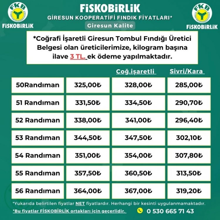 18.09.2025 Fiskobirlik 50 randuman tombul fındık alım fiyatı 325 TL olarak revize edildi.