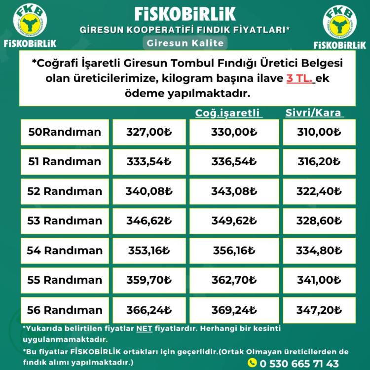 FİSKOBİRLİK, 2025 ürünü fındık alım fiyatlarını yukarı yönlü revize etti. Coğrafi işaretli 50 randuman fındık 330 TL/KG, %50 randuman sivri ve karar fındığı ise 310 TL/KG fiyattan işlem görüyor.