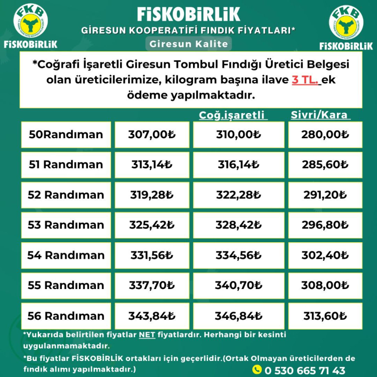 Fiskobirlik, tam adıyla Fındık Tarım Kooperatifleri Birliği, Giresun kalitesinde Coğrafi işaretli 50 randıman fındığın alım fiyatını 22.10.2025 tarihinden itibaren 310 TL/KG olarak yeniledi.