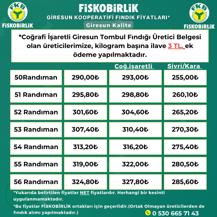 Fındık Tarım Satış Kooperatifleri Birliği, 19 Kasım 2025 tarihinde yeni fiyat listesi yayınlayarak 14 Kasım 2025 tarihi itibarıyla fındığa verdiği fiyatı devam ettirdi.