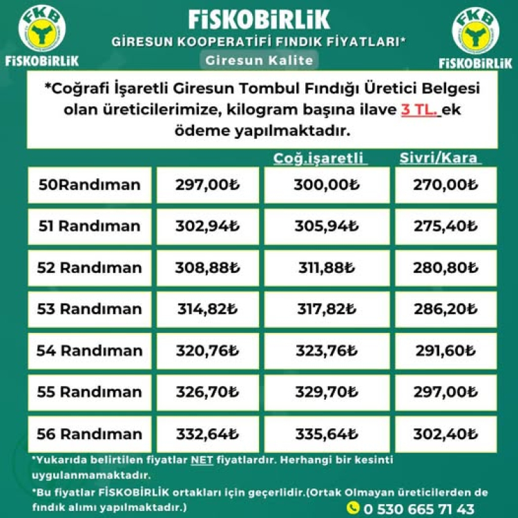 Bu fiyatlar, FİSKOBİRLİK ortakları için geçerlidir. (Ortak olmayan üreticilerden de fındık alımı yapılmaktadır.) Ortak dışı alım fiyatlarımız farklılık göstermektedir.