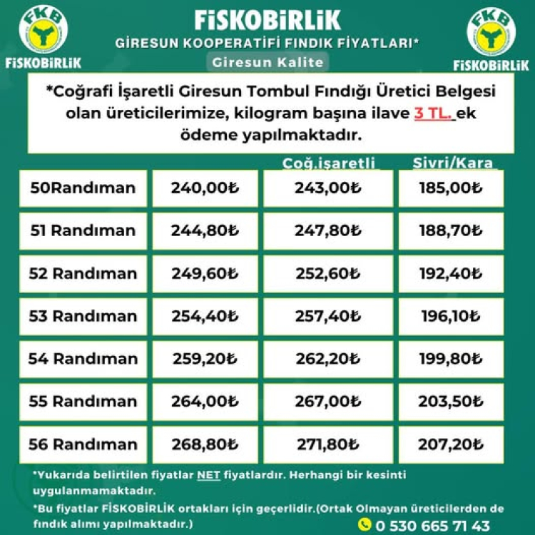 FİSKOBİRLİK’in yeni listesinde Giresun kalite 50 randıman fındık 240 liraya indi.