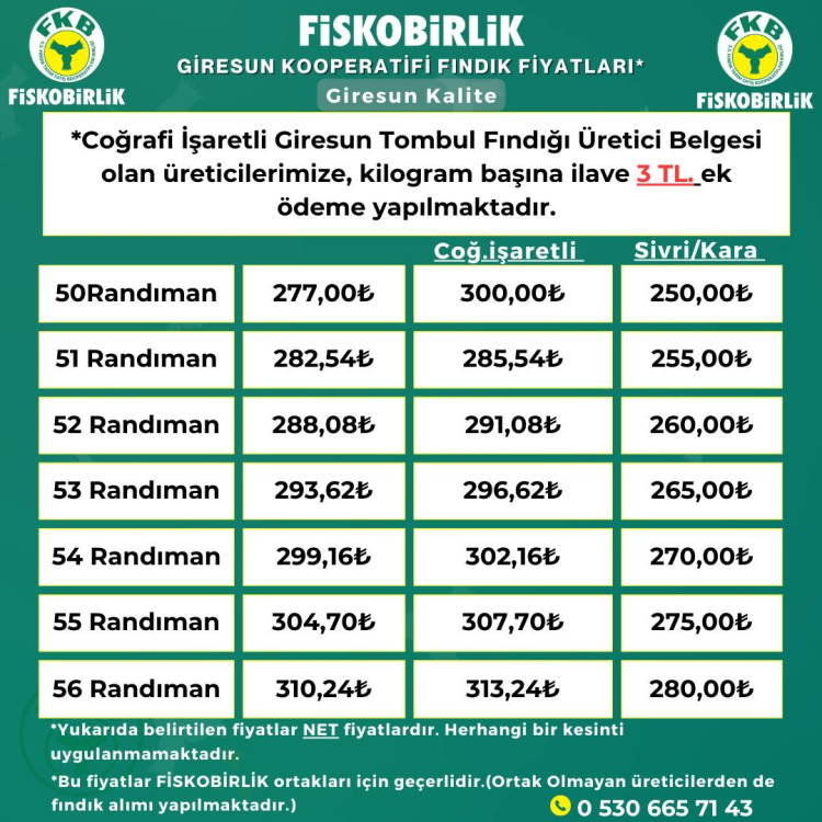 FİSKOBİRLİK, Giresun kalite tombul fındığın alım fiyatını 277 TL/kg olarak açıkladı. Coğrafi işaretli ürünler için fiyat 300 TL/kg. Üretici belgeli üreticilere ek 3 TL ödeme yapılıyor. TMO ise fiyatı 200 TL'de tutuyor, serbest piyasada ise 260 TL.