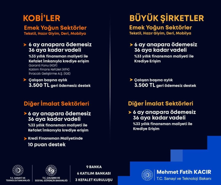 Program, 5510 sayılı Kanun’un 4/1-a bendi kapsamında sigortalı çalışan istihdamının korunmasına ve artırılmasına katkı sağlamayı amaçlıyor. NACE Kodu Kısım C – İmalat başlığı altında faaliyet gösteren KOBİ’ler ile büyük ölçekli işletmeler, anlaşmalı bankalar üzerinden kredi kullanabilecek.