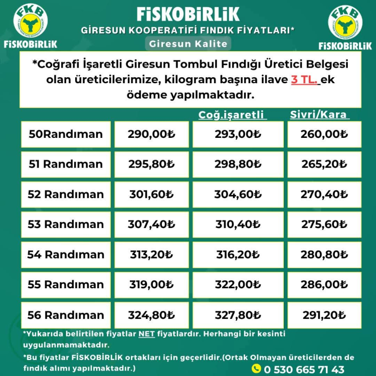 Fındık Tarım Satış Kooperatifleri Birliği, 14 Kasım 2025 tarihi itibarıyla 50 randıman tombul fındık fiyatını 290 TL/KG olarak güncelledi.