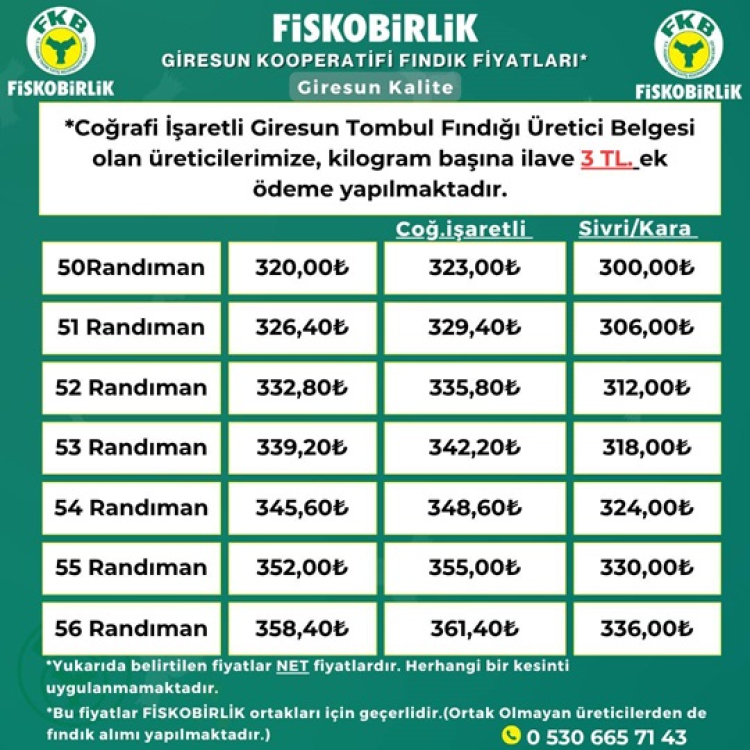 Fiskobirlik, Fındık Tarım Satış Kooperatifleri olarak, 13 Ekim 2025'te hafta sonunda belirlenen 50 randıman tombul fındık alım fiyatını 15 TL azaltarak kamuoyu ile yeni fiyatı paylaştı.