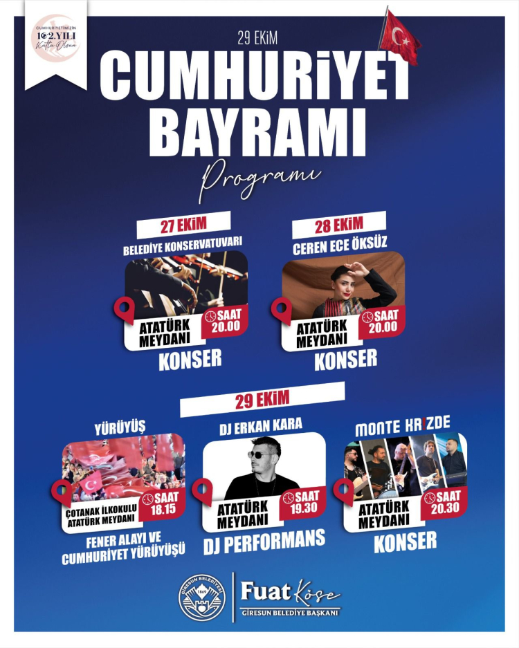 Giresun Belediyesi, 29 Ekim Cumhuriyet Bayramı'nı coşkuyla kutlamak için etkinlikler düzenliyor. 27-29 Ekim'de konserler ve yürüyüşlerle dolu program, Başkan Fuat Köse'nin birliğe davetiyle halka sunuluyor. Etkinlikler Atatürk Meydanı'nda gerçekleşecek.